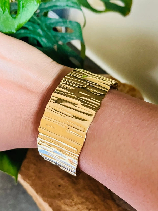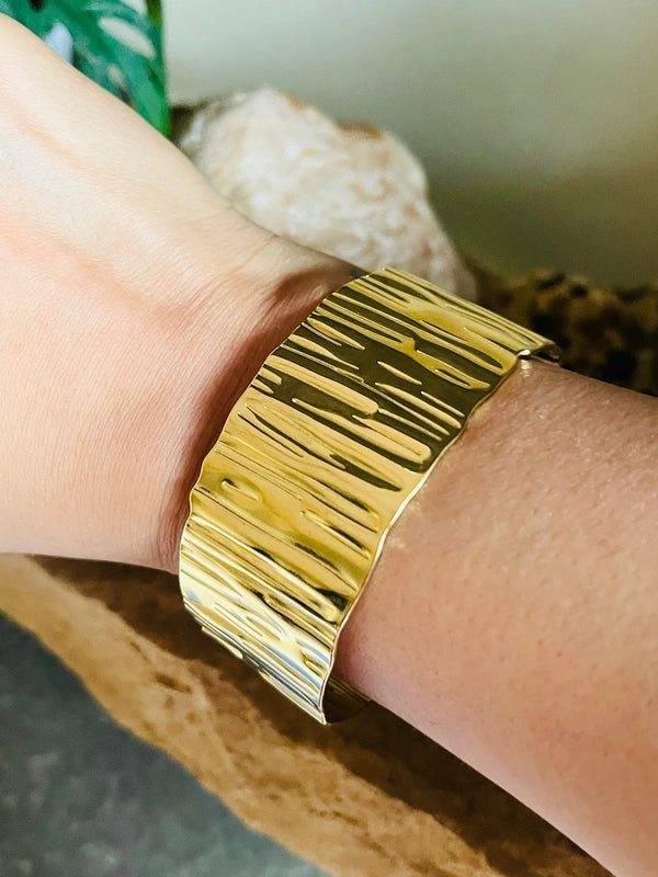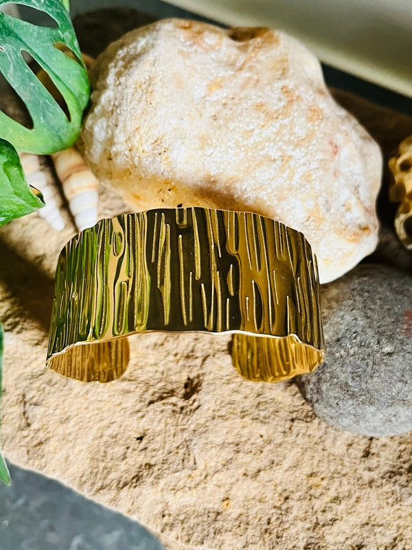 This cuff has such a raw, organic, and textured feel — like tree bark, flowing water, or rock formations.