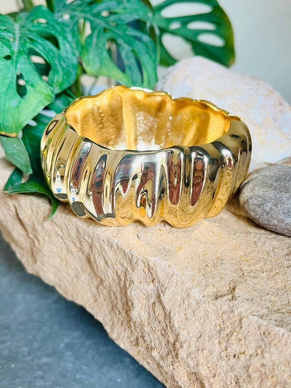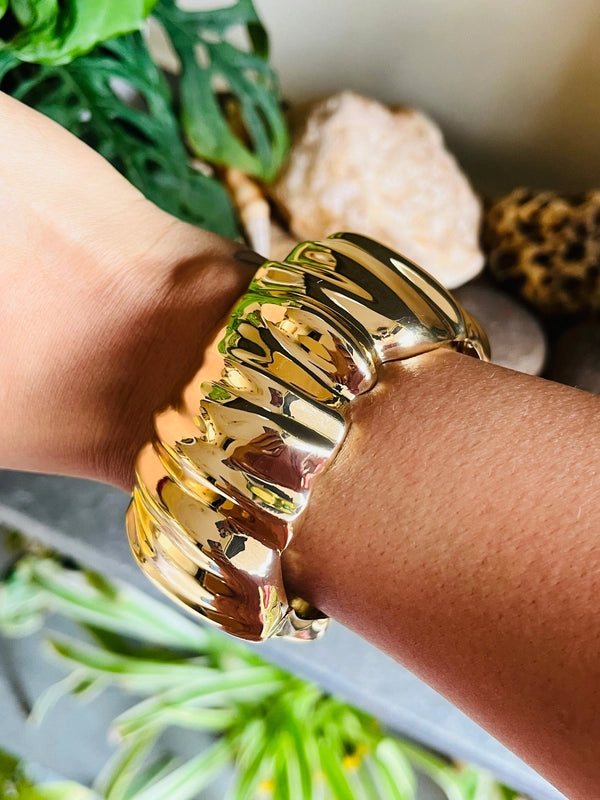 This cuff has a bold, sculptural, and rippled look — almost like molten gold frozen mid-motion or folds of rich fabric caught in a breeze. The deep grooves give it a volcanic, organic, or seashell-like texture, making it feel dramatic yet elegant.