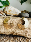 These earrings feature an iridescent dual-tone stone that shimmers beautifully. Framed in 18k gold-tone metal with delicate floral accents, they’re the perfect blend of charm and sophistication for any occasion.