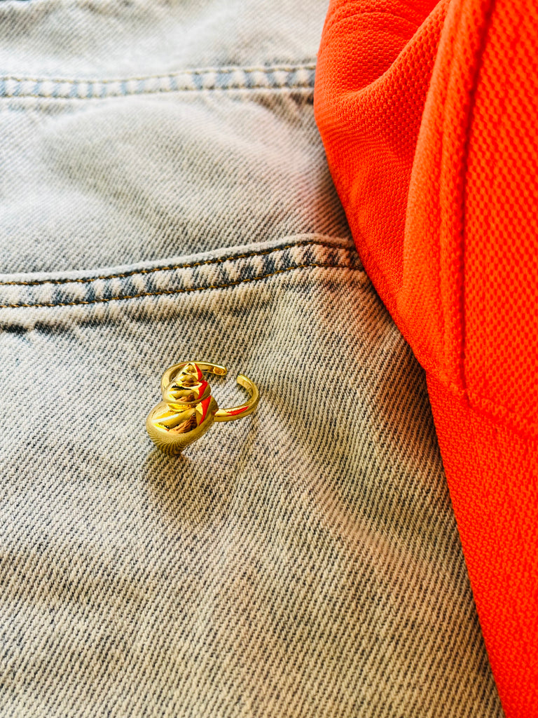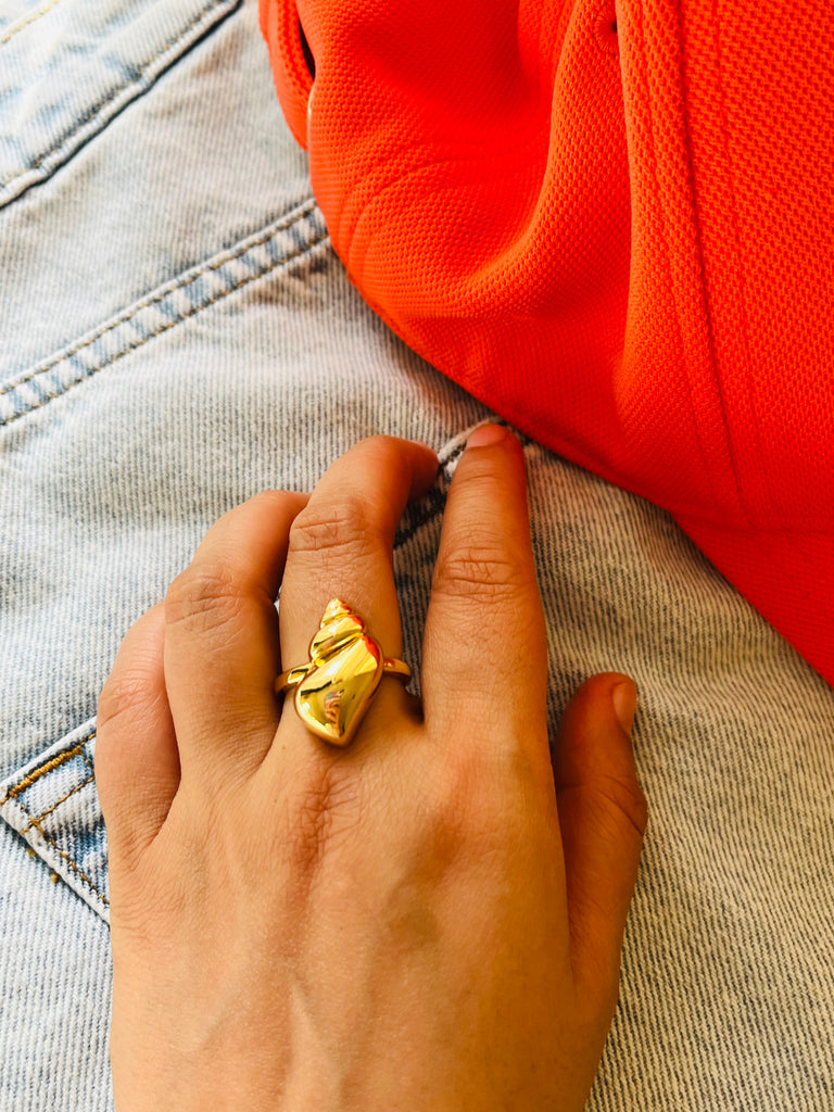 This beautiful gold ring features a shiny spiral shell-like form with a smooth, polished texture — reminiscent of a sea snail or conch with a modern, minimal twist.