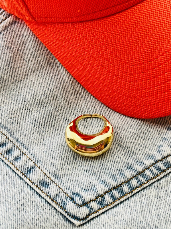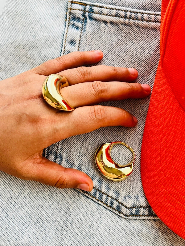 The high-polish surface and fluid, asymmetric dome resemble molten metal mid-flow, like gold in its liquid state. This is a unique and yet a statement ring to flaunt!